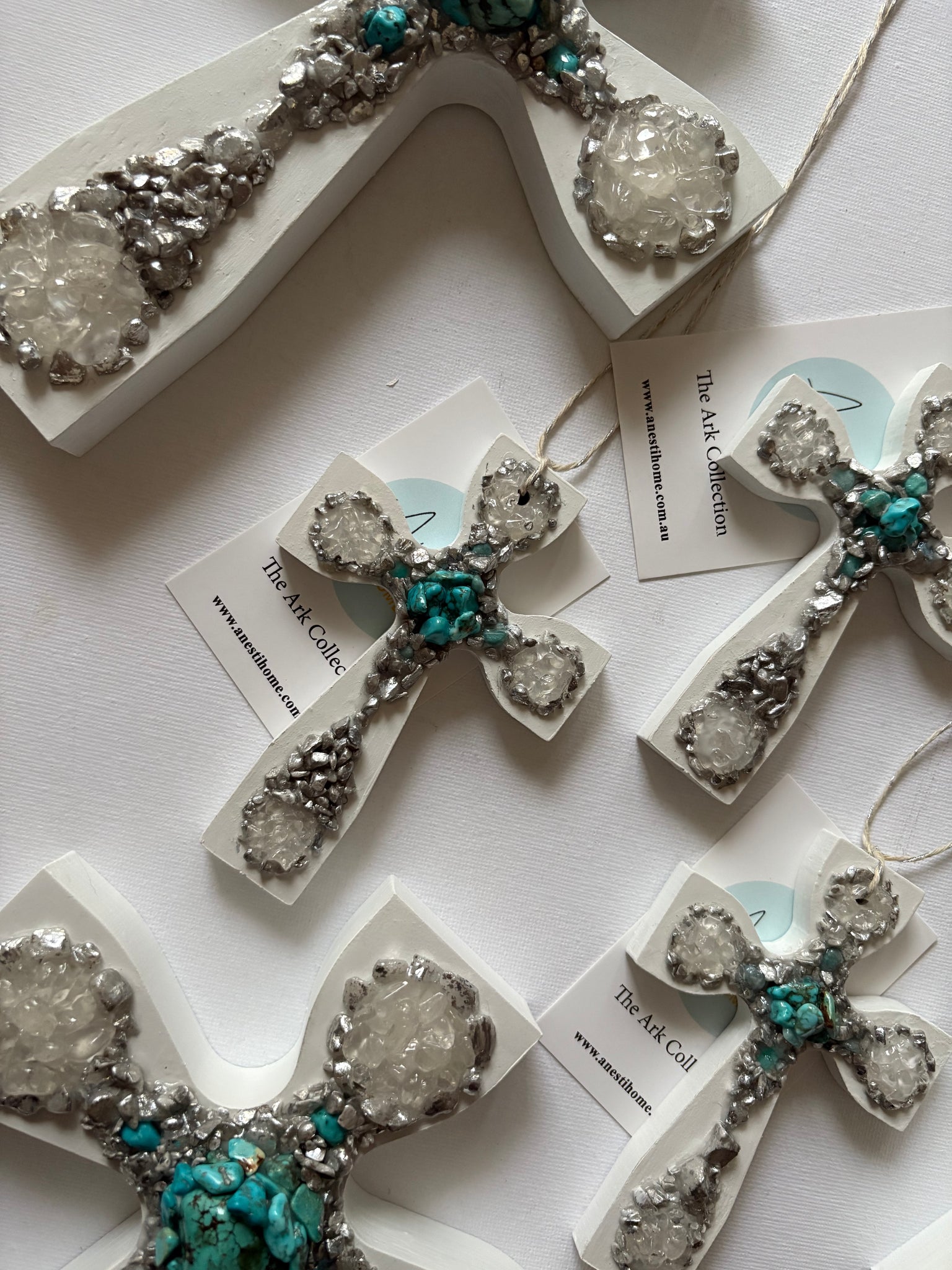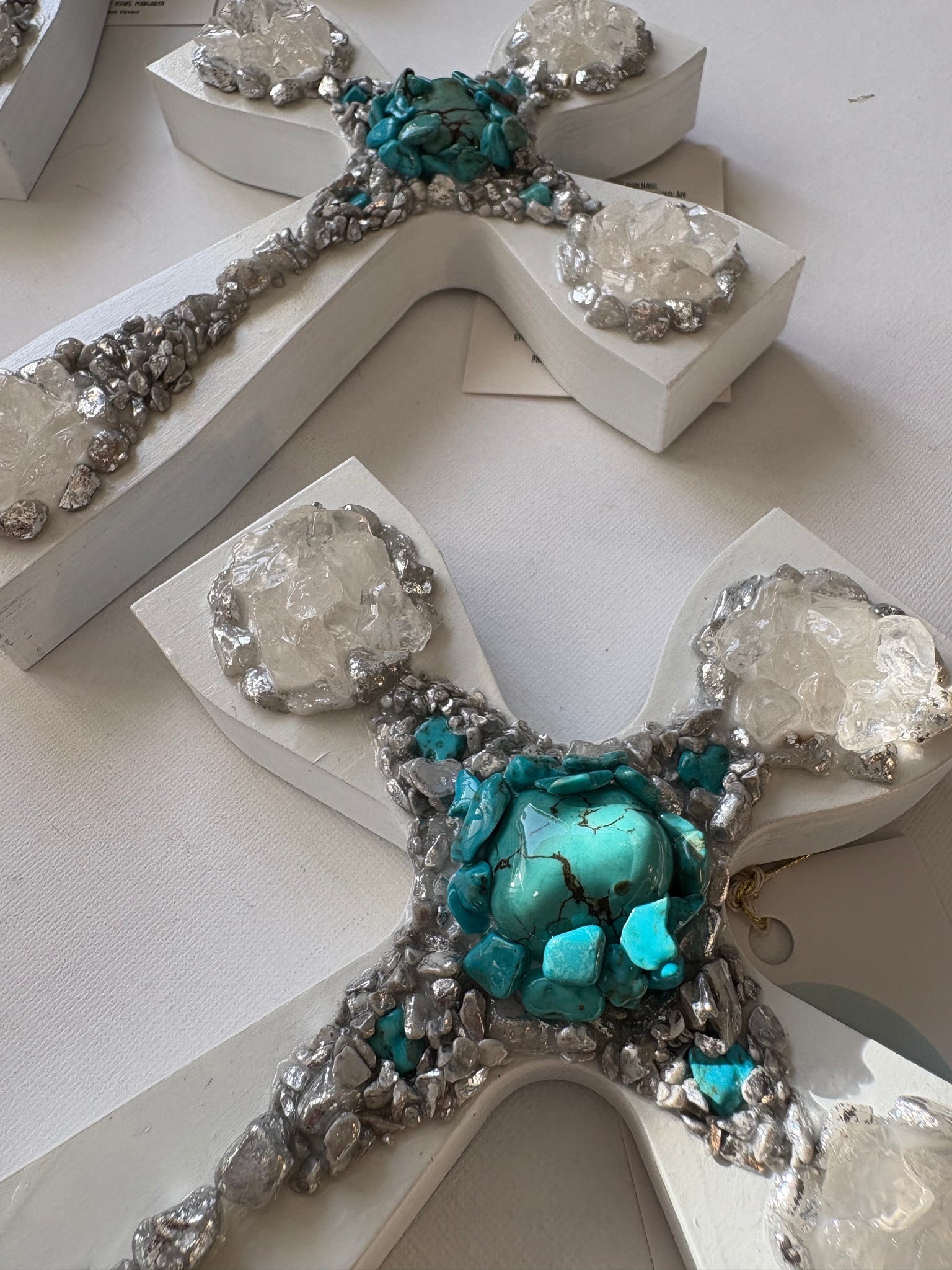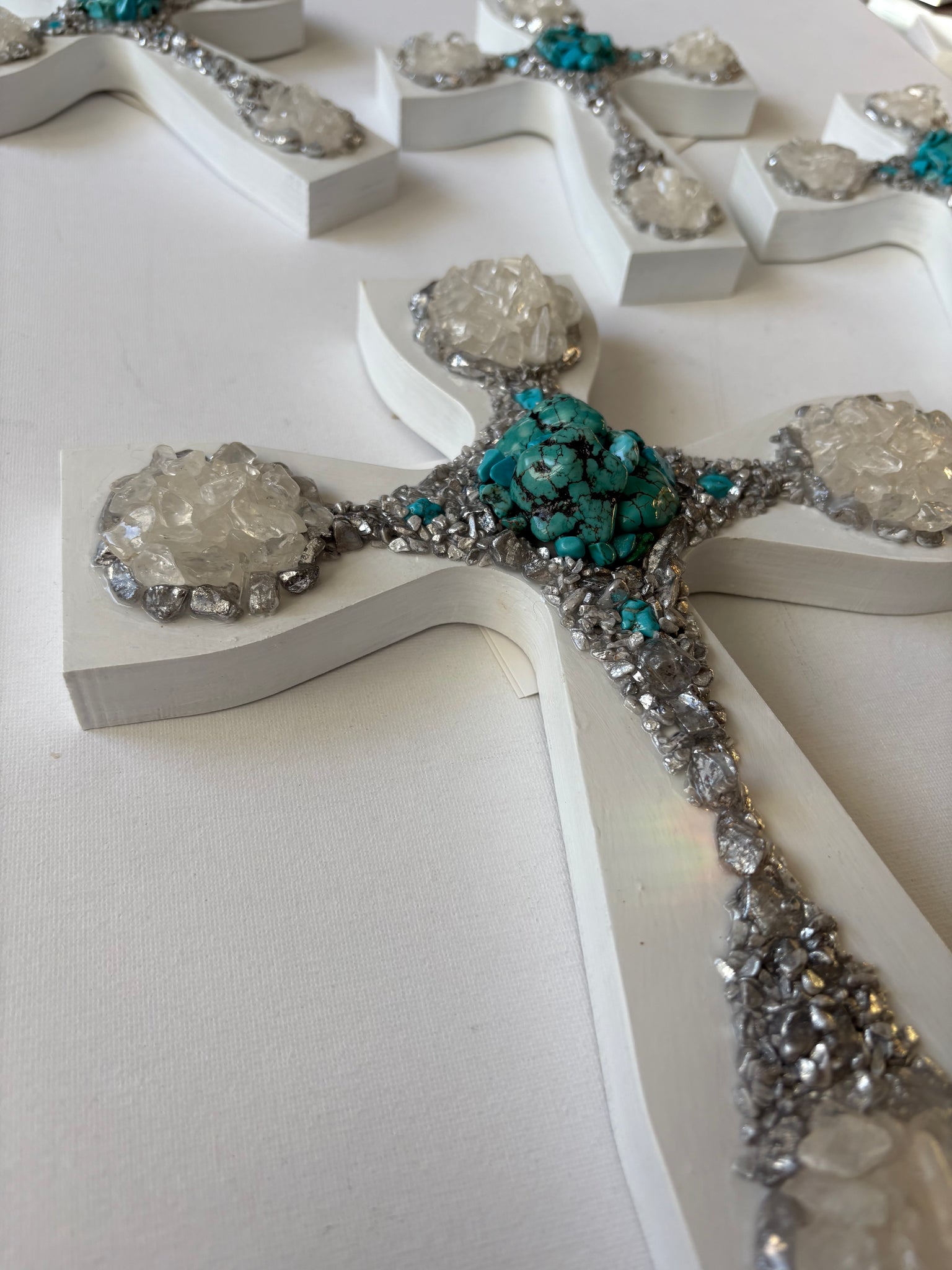 The unity cross is combination of clear quarts, turquoise, enhanced silver stones.